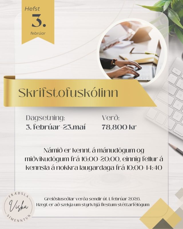 Námsleiðir 2026 Skrifstofuskólinn Námsleiðir 2026 78.800 kr. Grunnnámskeið f. fiskvinnslufólk Námsleiðir 2026 23.000 kr. Skref til sjálfshjálpar Námsleiðir 2026 19.700 kr. Færni á vinnumarkaði Námsleiðir 2026 46.400 kr.
