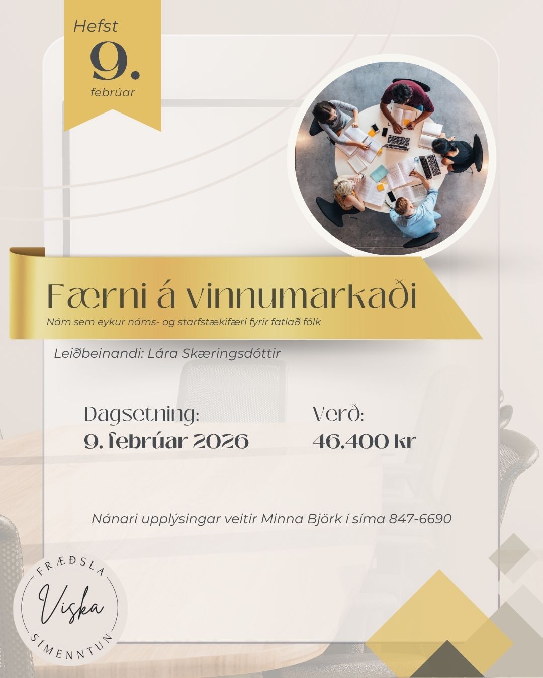 Færni á vinnumarkaði er útfærsla á tillögu starfshóps um aukin náms- og starfstækifæri fyrir fatlað fólk og er hluti af framkvæmda landsáætlunar um réttindi fatlaðs fólks. Verkefnið er styrkt af félags- og vinnumarkaðsráðuneyti og fer af stað í fyrsta sinn á landsvísu núna um miðjan september. Námið er 70 klst fræðsla og 110 klst starfsþjálfun, samtals 180 klst. Að loknu námi fá þeir þátttakendur sem standast hæfnimið staðfestingu á hæfni með Fagbréfi atvinnulífsins. Fræðslu hluti námsins fer fram 2x í viku, Mánudaga 09:00-12:00 og miðvikudaga 13:00-16:00 í VISKU Vestmannaeyjum og starfsþjálfun á mismunandi vinnustöðum 3x í viku ca 2-3 klst í senn. Megintilgangur með náminu er að nemar fái góða innsýn í að leysa verkefni sem felast í starfinu sem námslýsing fæst við, læri og þjálfist í vinnulagi, verkkunnáttu, vinnusemi og samstarfi. Áhersla er á almenna og starfstengda starfshæfni nema eins og hún hefur verið skilgreind hjá Fræðslumiðstöð atvinnulífsins (FA). Í fræðslunni verður farið yfir allt milli himins og jarðar sem viðkemur því að vera starfsmaður, allt frá því að ræða heilsueflingu, samskipti, verklag og yfir í reglur og skyldur á vinnumarkaði.