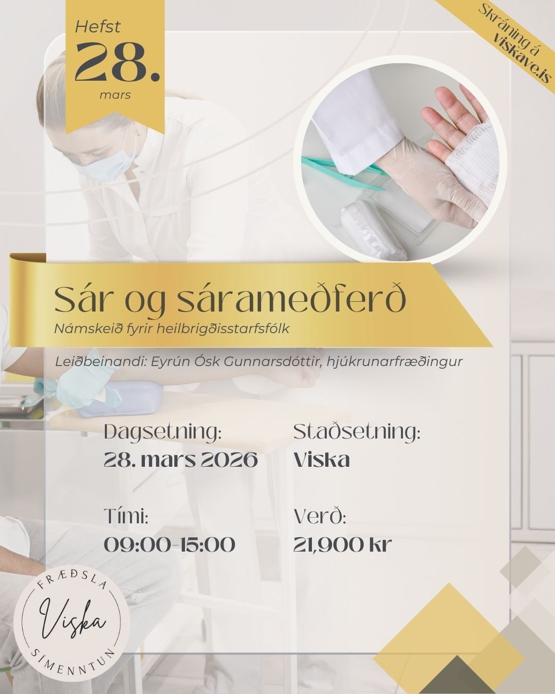 Á námskeiðinu verður fjallað um líffræði húðar,almennt um gróningu sára, helstu tegundir sára og mismunandi meðferð, umbúðir og eiginleika þeirra. Verkleg kennsla í umbúðalögum. Einnig fjallað um það hvernig andlegir þættir geta haft áhrif á bata sjúklings.